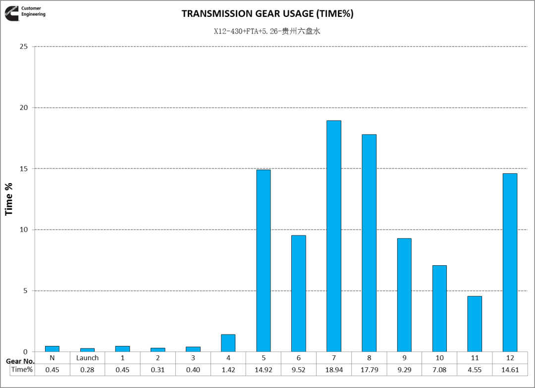 从全程挡位分布看,配置福康X12动力的欧曼自卸车整体运行挡位高于其他车辆,与用户描述的X12车辆爬坡经常比其他车辆多一个挡位相符;说明福康X12动力的重载动力性优于其他车辆。